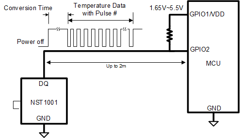 NST1001 is a high-precision double-pin digital output temperature sensor. The NST1001 has the characteristics of pulse counting digital output and high accuracy in a wide temperature range. It can be directly connected with MCU to ensure the measurement accuracy and reduce the cost. The NST1001 device supports the maximum accuracy of ± 0.5 ° C in the temperature range of – 50 ° C to 150 ° C, and has a very high resolution (0.0625 ° C), without system calibration or software and hardware compensation. Pulse counting digital interface is designed to directly connect GPIO or comparator input, thus simplifying hardware implementation. The simple dual-pin structure makes the NST1001 device easy to convert into a dual-wire temperature probe.
